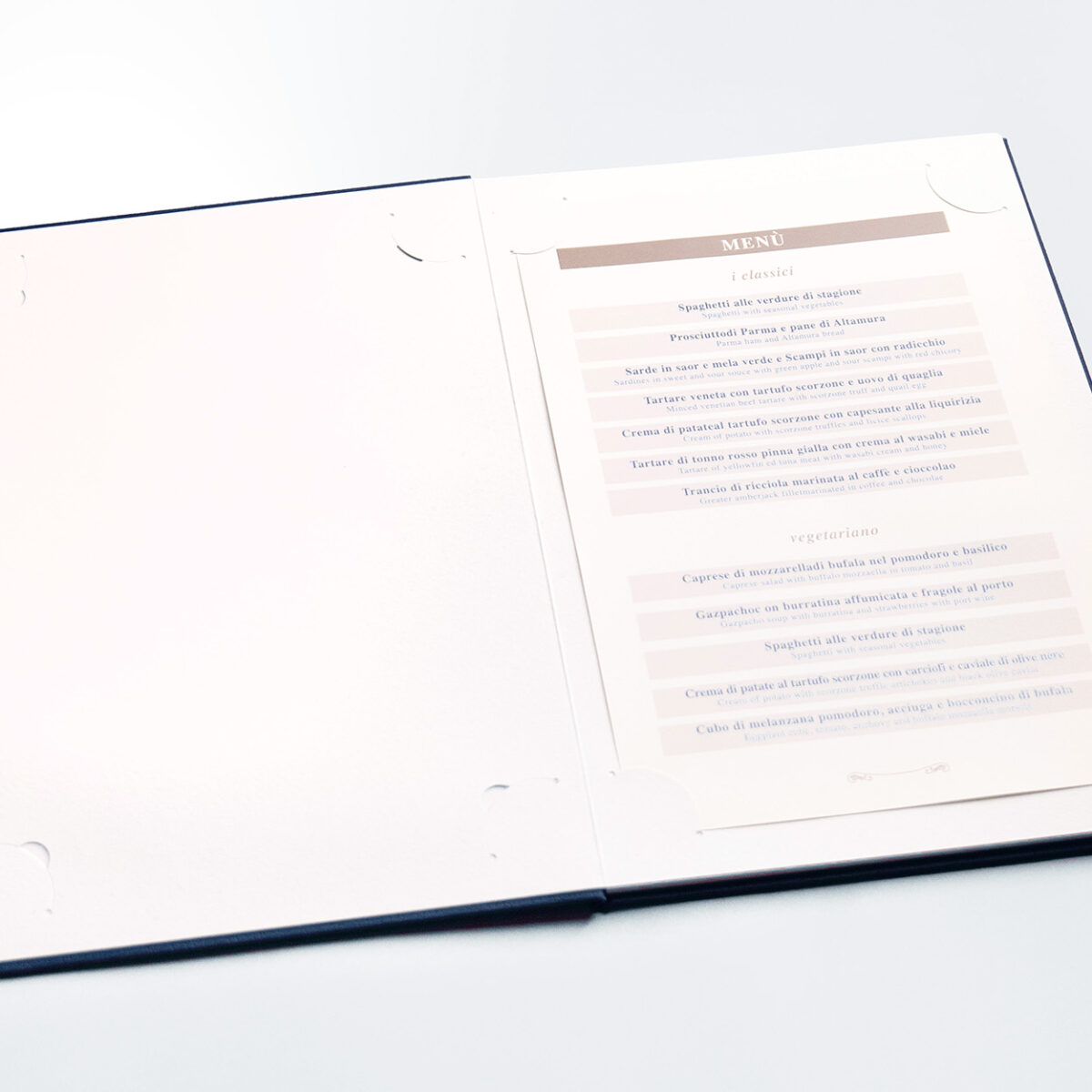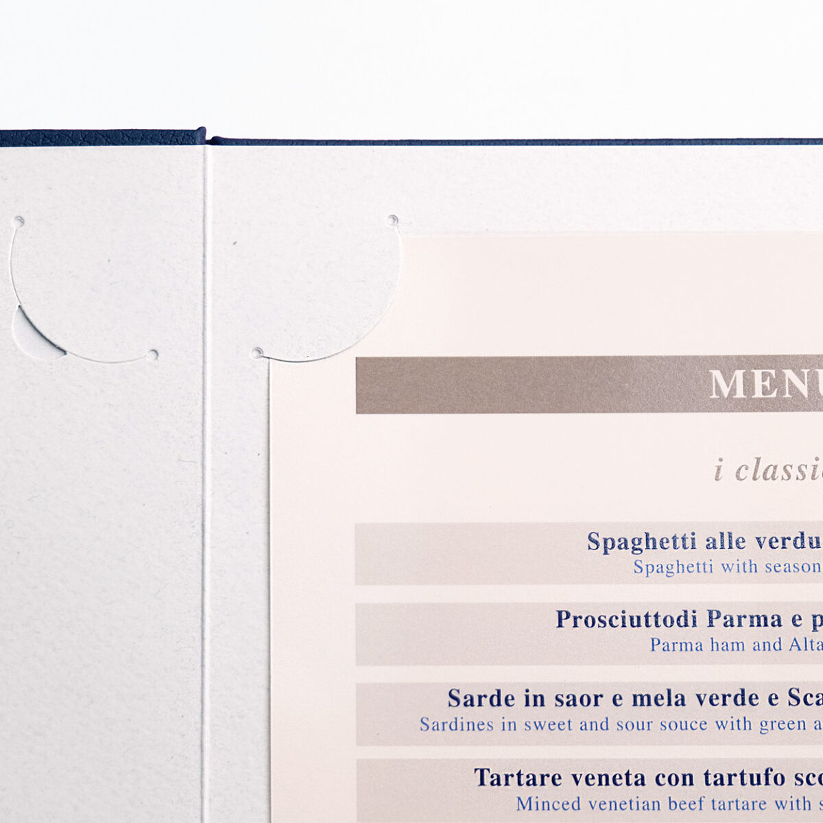 - Elegante cartoncino fustellato con lunette utili all'alloggiamento del menù per il formato scelto